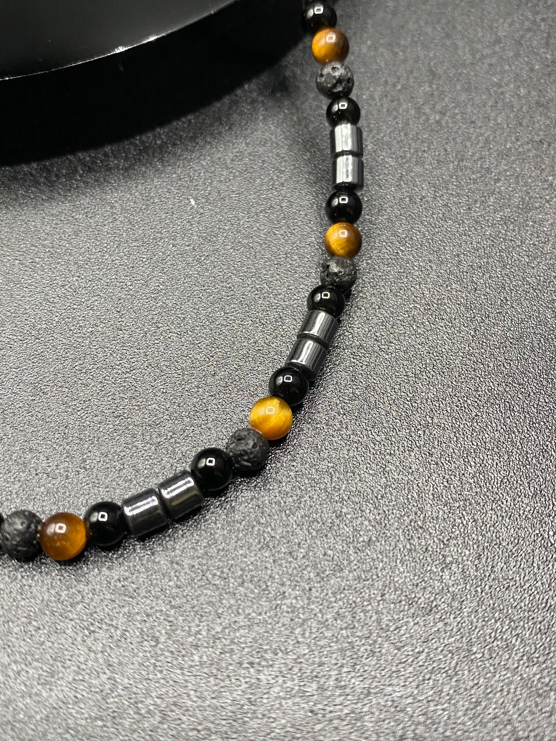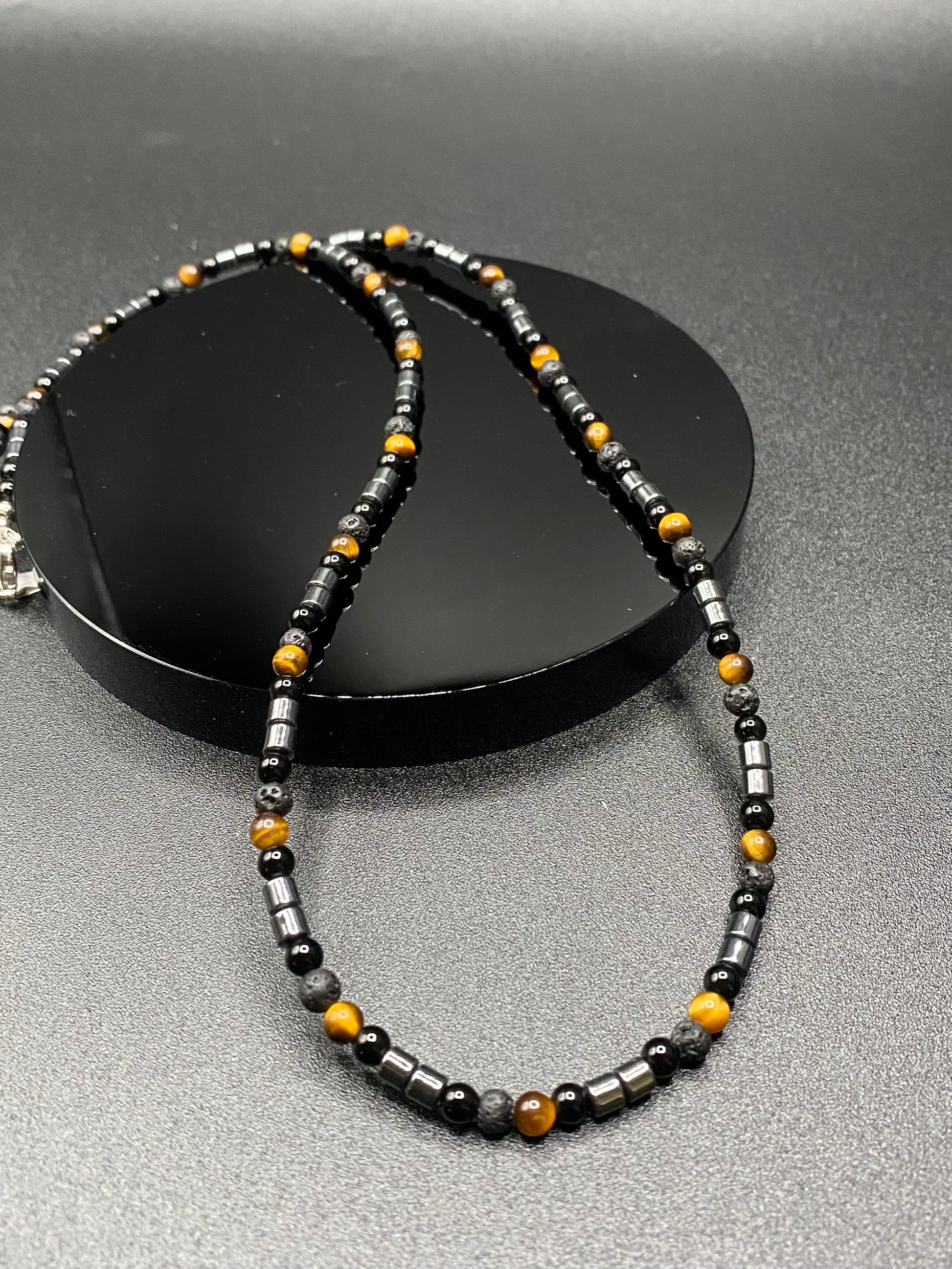 A protection necklace with Hematite, Black Onyx, and Lava stone beads. Hematite grounds and stabilizes energy, while Black Onyx provides protective strength. Lava stone adds natural texture and can hold essential oils. Perfect for daily wear or as a meaningful gift.